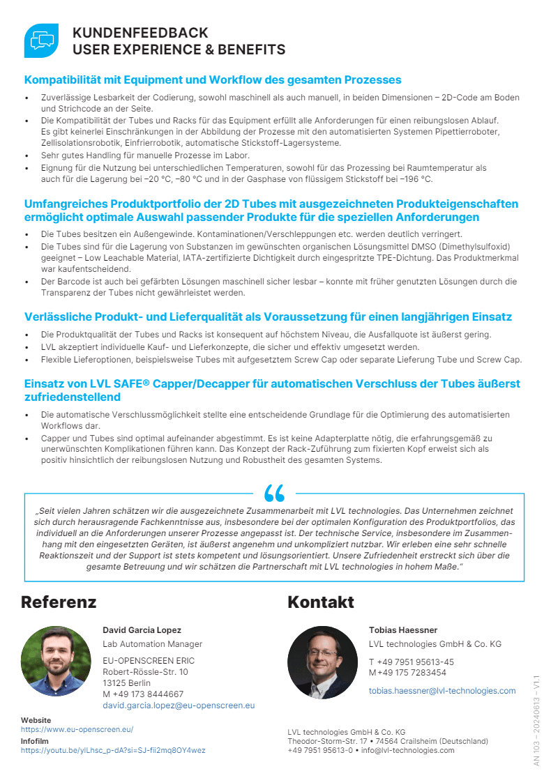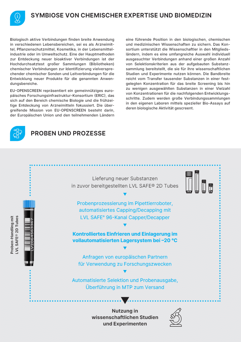 Für den hochkomplexen Prozess der automatisierten Einlagerung von Substanzen in Dimethylsulfoxid (DMSO) bei –20 °C werden die LVL SAFE® 2D Tubes und Racks von LVL technologies verwendet – zusammen mit dem LVL SAFE® 8-Kanal- und 96-Kanal-Capper/Decapper.