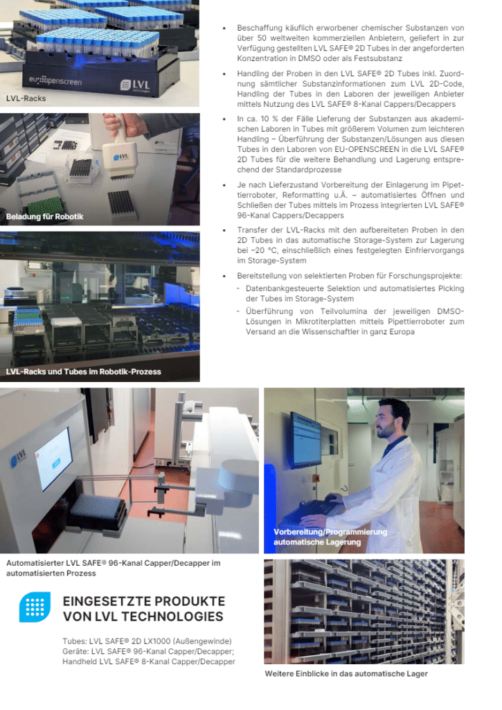 Für den hochkomplexen Prozess der automatisierten Einlagerung von Substanzen in Dimethylsulfoxid (DMSO) bei –20 °C werden die LVL SAFE® 2D Tubes und Racks von LVL technologies verwendet – zusammen mit dem LVL SAFE® 8-Kanal- und 96-Kanal-Capper/Decapper.