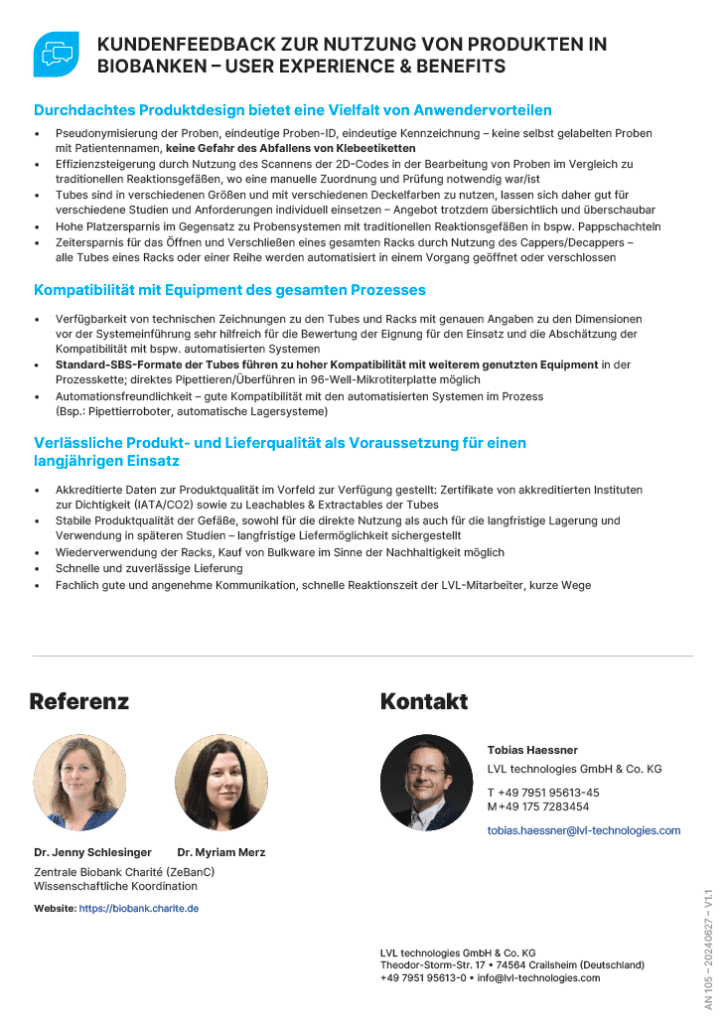 Mit den LVL SAFE® 2D Tubes sind die nachweisbar sichere und platzsparende Lagerung verschiedener Probenarten sowie sichere Identifizierbarkeit möglich. Die Produkte sind neben dem Einsatz für manuelle Laborprozesse auch hervorragend für die automatisierte Verarbeitung und Lagerung in allen Temperaturbereichen geeignet.