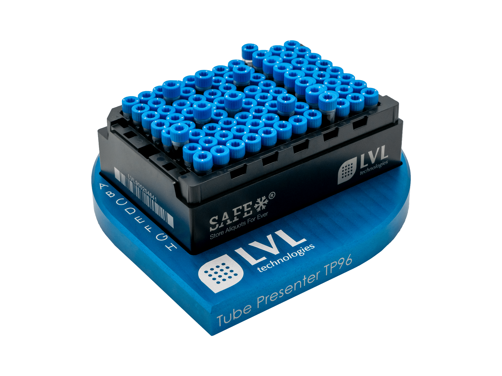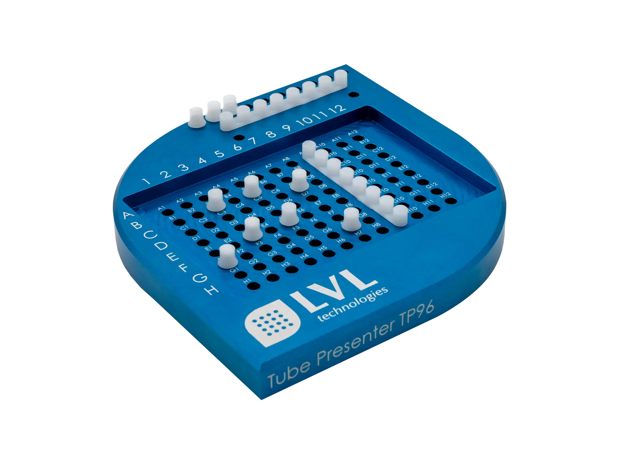The LVL TUBE PRESENTER TP96 offers a simple and efficient solution for handling and checking out individual samples. With this practical tool, you can place the single pin in the desired position, set the rack, and securely and easily remove the raised tube. For processing entire columns simultaneously, use the column pin. This allows for quick and error-free retrieval of the correct sample tubes, reducing the risk of mix-ups. The TP96 is compatible with various 2D SAFE® tube racks, enhancing its versatility and usefulness in everyday lab work.