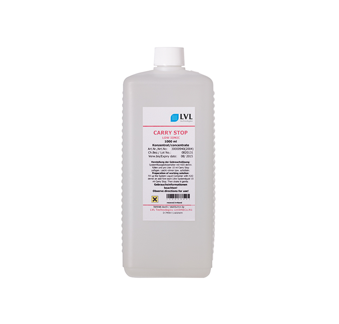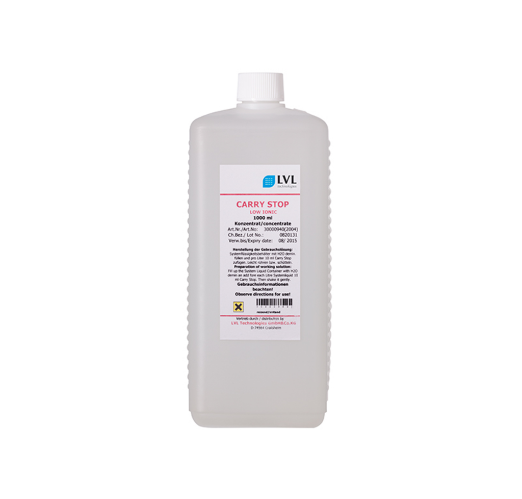Carry Stop is designed as an additive to the system fluid of pipetting and analysis systems. It remains present and active in the system during the routine operation of the automated devices. Carry Stop contains only special non-ionic surfactants, unlike the detergents found in “universal cleaners.” This results in three crucial advantages for the safety of laboratory automation: