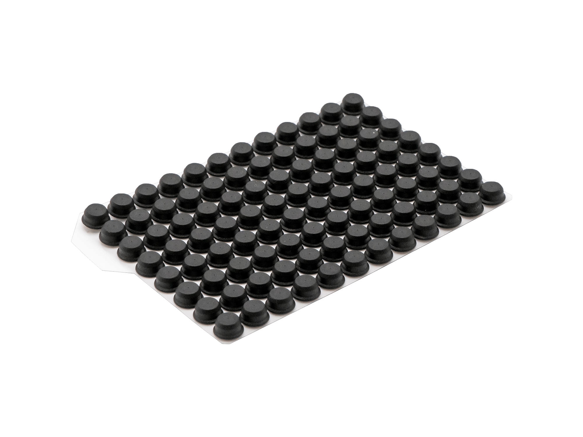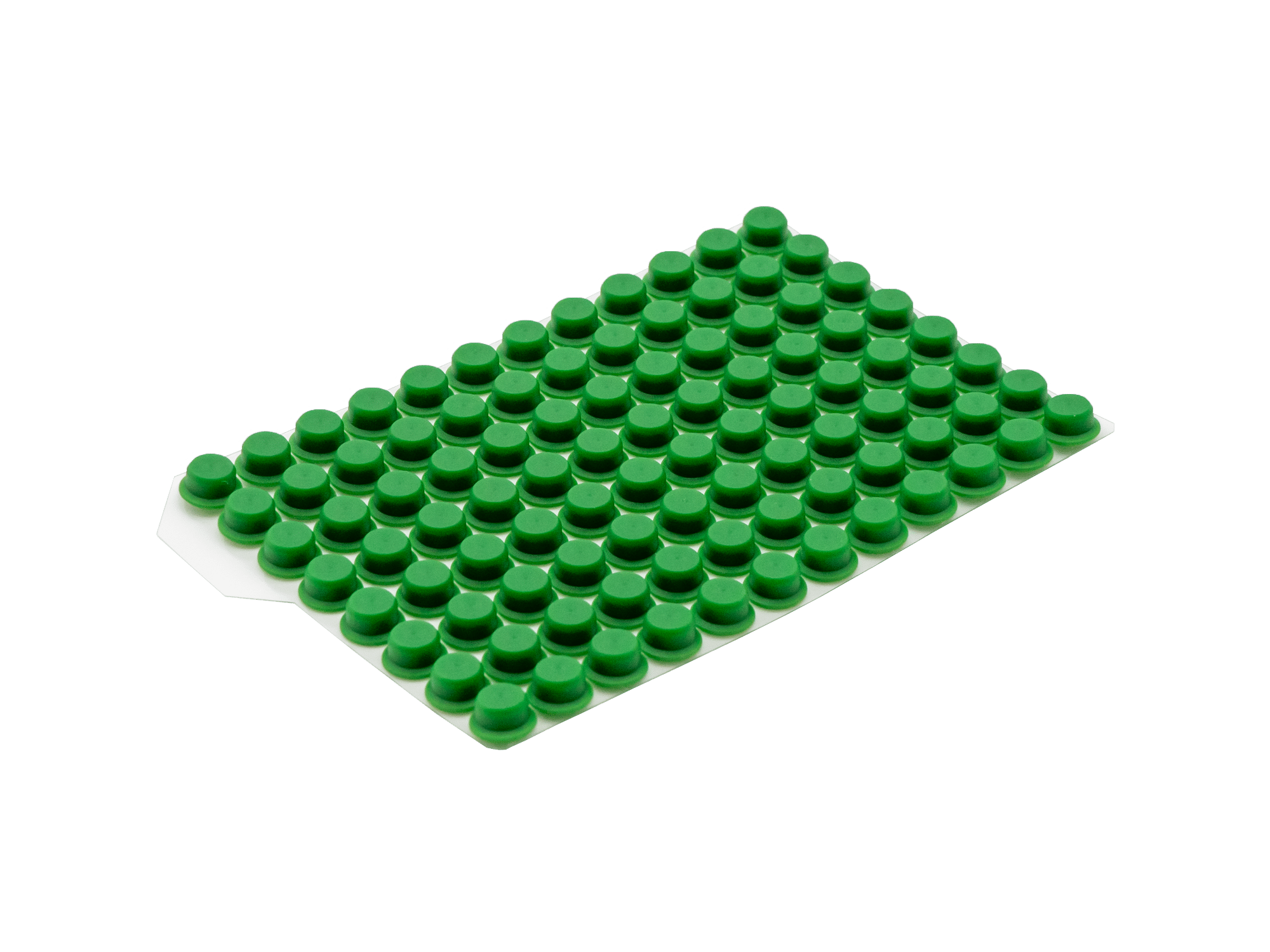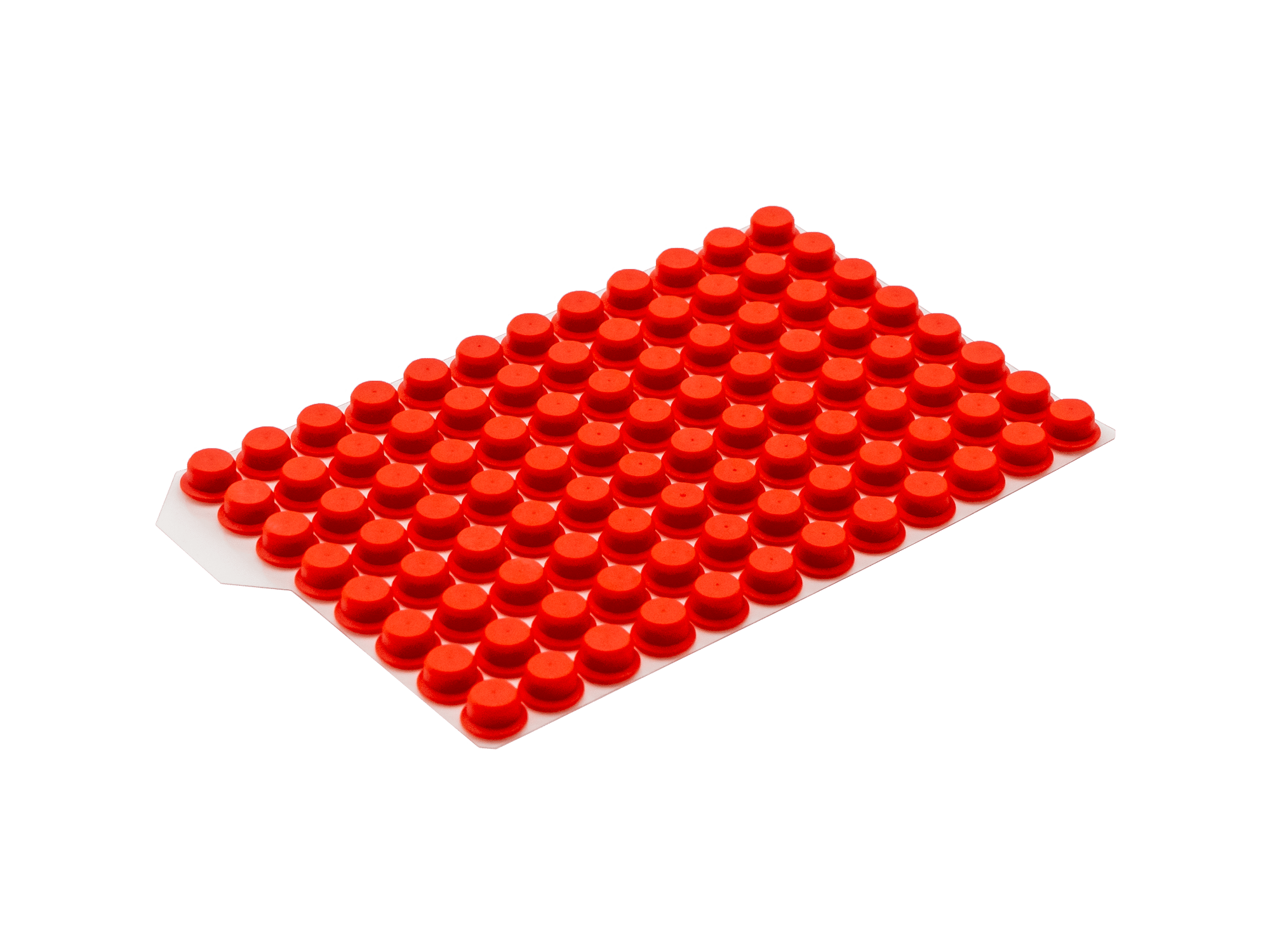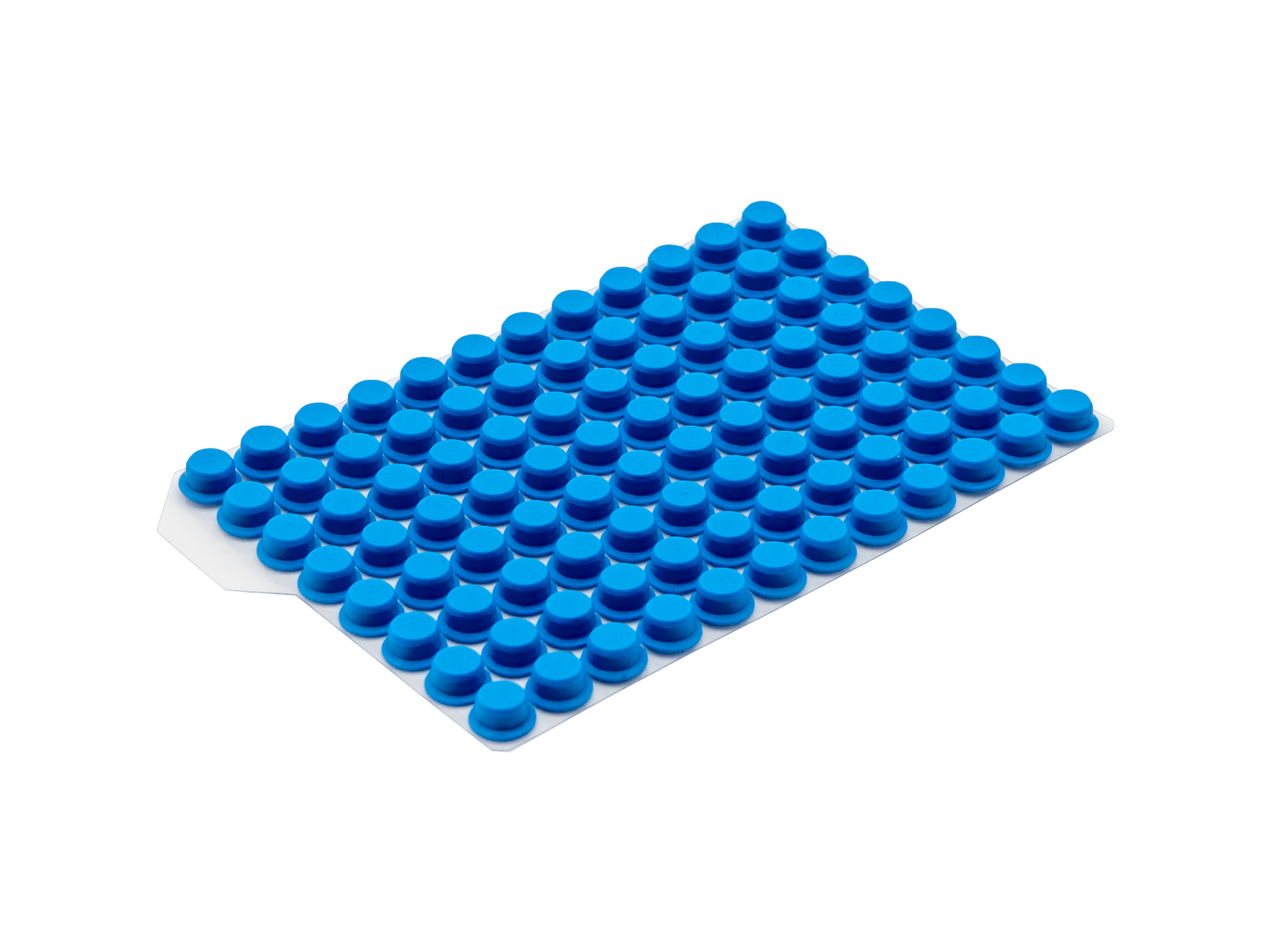 Materials and Features: The Push Caps are made from thermoplastic elastomer (TPE) and are easy to handle. By pressing the mat once, you can simultaneously seal 96 tubes individually. The Push Caps are also available in strips of 8 and 12.