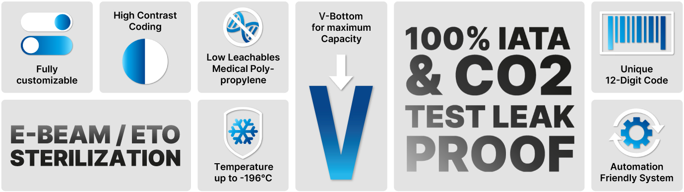 Individual Coding The tube provides ample space for individual coding, allowing you to add specific information about your lab or samples. The black side surface is laser-etched with the LVL logo by default and can be customized to your specifications at no additional cost.